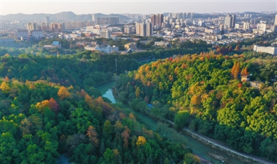 ② 淦河月亮湾段,河两旁的树木换上了斑斓的盛装。