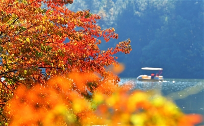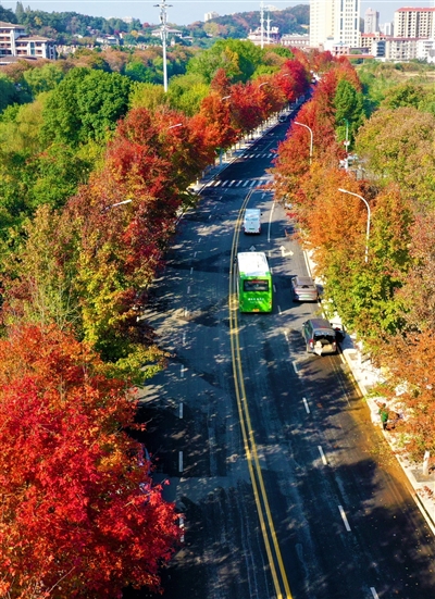 ④ 城区孟养浩东路,两行枫树已悄然染红,宛如两条蜿蜒的红绸带,在阳光下熠熠生辉。