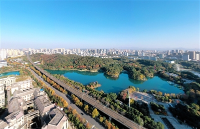 11月28日,航拍镜头下的十六潭公园水面如镜,岸边的林木已晕染开秋冬的斑斓色彩,金黄、橙红与深绿交织铺展,宛如一幅天然的油画,在暖阳的照耀下,色彩愈发鲜艳夺目。