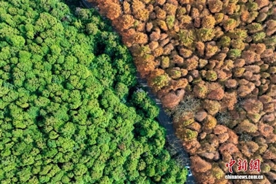 初冬时节,位于重庆南川的山王坪喀斯特国家生态公园层林尽染。公园里的上万亩水杉林和柳杉林层次分明、色彩斑斓,宛如一幅精美的画卷,吸引不少市民、游客前来赏景游玩。