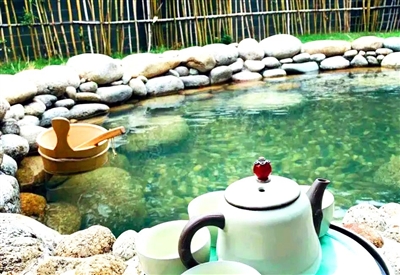 除了汤池,园区内还有茶点区、休息区、自助餐区等,让人泡完温泉后能迅速恢复体力。冯珺坐在休息区,一边和友人喝着热茶,一边看着远处的山景,一身的疲惫都卸下了。