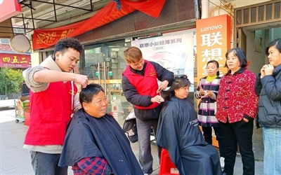 “叔叔,您坐这儿,想剪个什么发型?”在免费理发摊位前,72岁的陈爷爷刚坐下,志愿者小刘就轻声询问。