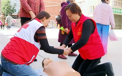 急救科普摊位上,市义工协会的志愿者正跪在模拟人旁:“胸外按压要快速、有力,每分钟100到120次。”几位居民轮流上前实践,手法从生疏逐渐变得规范。