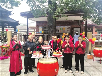 上午9点,伴随广播里《社会主义好》的音乐响起,该中心40多位老人齐聚院区广场做健身早操。行动不便的特护老人在广场旁就座,护理员则为其按摩手脚、协助康复训练。