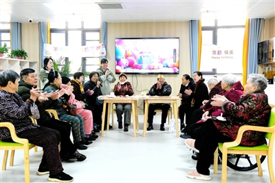 12月初,记者来到位于浮山街道长安社区的来宁享福综合养老服务中心,见证了一场温馨的集体生日会。92岁的陈元云和74岁的艾望仙头戴鲜艳的生日帽,在众人的祝福声中吹熄蜡烛,笑容灿烂(如图)。负责人章浩锐穿梭其间,不时为老人递上水果。