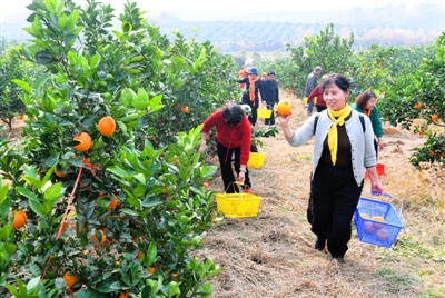 近日,嘉鱼县陆溪镇石壁山脐橙基地,游客在脐橙园里进行采摘、团建,感受乡村之美。