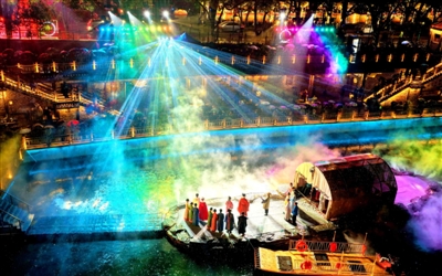 濯足廊前水面雾气氤氲,由船型小岛与两艘游船构成的舞台,静静依偎在曲水环流之中。随着悠扬乐声响起,“温泉沸波”惠民演出正式开演。潜山青黛如屏,温泉轻烟袅袅,两叶扁舟逐流而行。演员们身着古风服饰载歌载舞,《月亮湾迎客歌》《扁舟谣》等节目轮番上演。演出以“冯京回乡省亲”为主线,将咸宁温泉特色与民俗风情巧妙融入歌舞之中。歌声在山水间回荡,太平灯的光影在水面摇曳,宋代风华与国潮元素交相辉映,让现场观众沉浸式感受桂乡的热情与雅致。“这是我来咸宁后第一次观看这场演出,感觉非常震撼!”来自湖北科技学院的巴基斯坦留学生马慕德兴奋地说。
