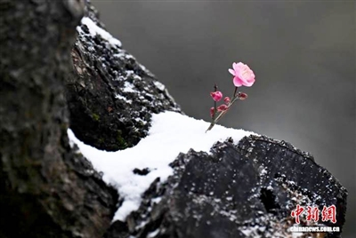 1月20日,梅花在枝头积雪中开放。当日,浙江杭州迎来降雪天气,西湖“灵峰探梅”景点部分梅花“凌寒独自开”,吸引游人观赏。
