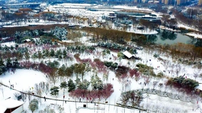 1月20日,河南郑州,雪后初霁,西流湖公园银装素裹,湖面、林木与远景交融,宛如一幅水墨画卷。