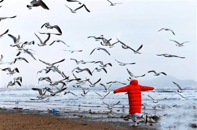 1月20日早晨,山东烟台第一海水浴场,民众在观赏喂食海鸥。海鸥们一跃而起,争抢食物,为冬日海岸增添灵动。