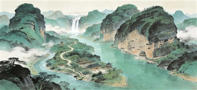 两岸的山,如屏风似的立着,是典型的丹霞地貌。大自然亿万年的鬼斧神工,将龙虎山雕琢成奇峰突出、秀出天外的瑰丽风光。《水浒传》称其“远看磨断乱云痕,近看平吞明月魄”“恰似青黛染成千块玉,碧纱笼罩万堆烟”。经了千万年风雨的剥蚀,上面布满了纵横的裂纹与孔窍,像一张老人布满皱纹的脸,又像一卷无人能识的、天书般的文字。忽然想起陆放翁的句子来:“山重水复疑无路,柳暗花明又一村。”此情此景,虽无柳暗花明,但这山水的开合、幽明的变化,却也给人一种绝处逢生的喜悦与禅意。