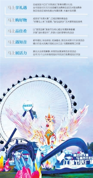 本次消费季市商务局、市文旅局、市体育局等多部门联动,投入超3亿元补贴,推出“马上购好物”“马上品佳肴”“马上遇知音”“马上展活力”“马上享礼遇”五大系列600余场特色活动,涵盖购、食、文、体等消费领域,用满满的年味与实惠,诚邀市民游客“来武汉 过大年”。