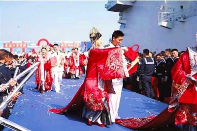 战舰为证,碧海为媒。仪式现场,新人们跨过火盆、马鞍,寓意家业兴旺、平安顺遂,主持人宣读集体婚书,宣告佳偶天成的喜事。新人向战舰、嘉宾、爱人三敬礼,致以崇高的敬意。随后,52对新人合卺交杯,许诺永结同心。