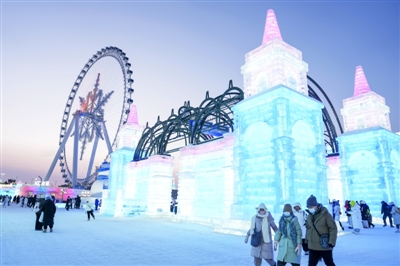 寒冬时节,哈尔滨冰雪大世界园区流光溢彩,吸引了来自天南海北的游客观赏游玩,畅享冰情雪趣。 (据新华社)