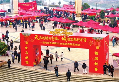 本报讯 通讯员甘源、胡昊宇报道:2月4日上午,崇阳县天城公园内锣鼓喧天、人潮涌动,洋溢着浓浓的年味。崇阳县天城镇2026年“天马送福迎新春·‘城’邀您来赶年货”新春赶集活动在此盛大开幕,这场集农文旅于一体的乡村盛宴,不仅为父老乡亲们带来了琳琅满目的年货和精彩纷呈的民俗表演,更通过“线上+线下”的创新模式,助力乡村振兴成果惠及更多群众。