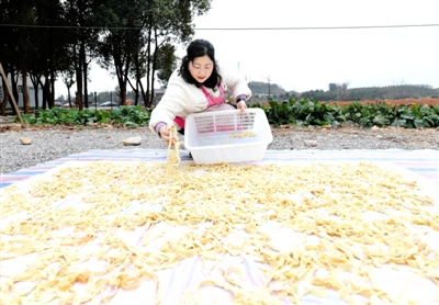 2月3日,嘉鱼县官桥镇石鼓岭村,村民石新喜在院落里将新鲜豆丝均匀摊开晾晒。这道传统年味食材需经泡豆、磨浆、蒸制等多道工序制成,是春节餐桌上的经典美味。春节临近,嘉鱼的很多农户忙着制作年食,用最朴素的方式让传统年俗在烟火气中焕发新生。