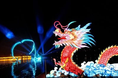 湖面全息投影光影秀如梦似幻。七彩拱门下,激光穿梭流转,时而化作遨游深海的巨鲸,时而幻化为奔腾千里的骏马,葫芦兄弟等经典动画形象跃然水上,唤醒无数人的童年记忆。26米长的水上龙灯蜿蜒游弋,与百米竹筏游龙相映成趣,水波倒影,如诗如画。