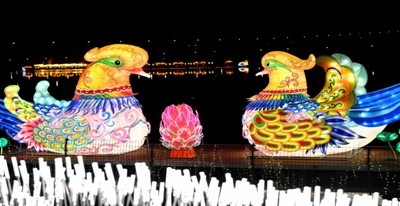 除了水上与舞台的视听盛宴,草地中央同样氛围感拉满。三座巨型热气球通体透亮,游客可登临其上,俯瞰整片灯海,将万千灯火尽收眼底。