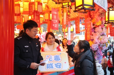 庙会主会场的“禁毒灯谜长廊”前,市民李女士一眼猜中灯谜谜底,接过印有“健康人生,绿色无毒”的文创手袋,笑得合不拢嘴。主办方精心设计120余条融合法治常识、禁毒知识的原创灯谜,将新型毒品防范要点巧妙藏于谜面,让禁毒学习变得趣味十足。