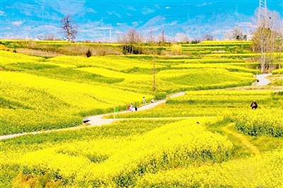 3月11日,陕西省汉中市汉台区皇塘水乡的油菜花盛开,形成连绵金色花海,吸引游客纷至沓来。