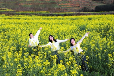 站在山坡上放眼望去,连片油菜花铺展成金色波浪,微风拂过,花浪起伏。游客或漫步花径,或驻足留影,或在花田间放声歌唱,尽情享受春日田园的诗意。