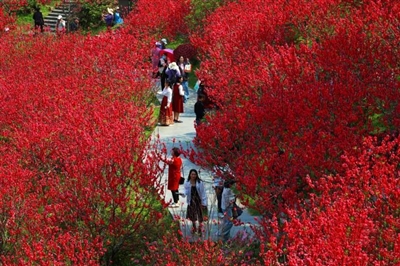 近日,广西南宁青秀山风景区的桃花进入盛花期,满树繁花竞相绽放,美不胜收,吸引游客前来赏花“打卡”。 (本报综合)