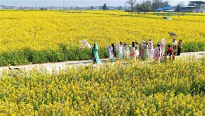 3月10日,崇阳县青山镇铺前村的七彩油菜花进入盛花期,连片花海在春日暖阳下铺展,身着汉服的游客前来赏花、拍照,将春日田园装点得更具韵味。据悉,这片油菜花海是当地春季热门打卡点之一,每年都会吸引众多游客前来邂逅春日景致。 记者 陈红菊 摄