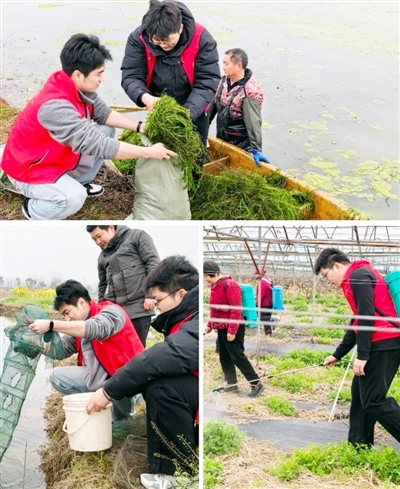 志愿者们走进田间地头,帮助农户清理果树周边杂草、喷施防虫药剂。同时下塘打捞水草,协助养殖户投喂虾苗,赢得村民们纷纷点赞。