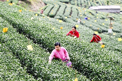 3月19日,通城县四庄乡寺背村卧龙沟生态有机茶业专业合作社,茶农们正抢抓农时,忙着采摘、制作春茶,供应市场。