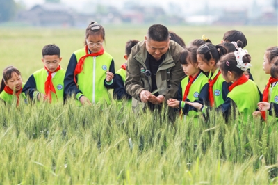 4月1日,在四川省眉山市彭山区观音街道兴崇社区千亩粮油基地,农业技术人员在田间为鹏利小学学生科普小麦播种技术、生长周期及现代农业科技应用等知识。