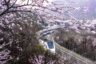 近日,一列客运列车穿行在北京市居庸关长城脚下的花海中。北京市居庸关长城脚下的山花竞相绽放,与穿行在花海中的客运列车交相辉映,美景如画。