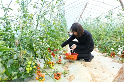 4月3日,咸安区马桥镇樊塘村绿佳绿色蔬菜基地里,棚内垂挂的玲珑千禧圣女果宛若红宝石,吸引不少游客前来采摘、品尝春日里的第一口鲜甜。