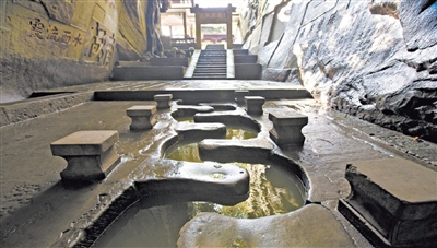 苏轼的友人、著名书法家黄庭坚也有“流杯之好”。元符元年(公元1098年),黄庭坚谪居戎州(今四川宜宾市),主持修建了凿于天然峡谷之中流杯池。据《嘉庆宜宾县志》等文献记载,“黄庭坚于其中甃(音zhòu,砖石砌筑的井壁)池九曲,为流觞之乐”“黄鲁直垒石为九曲,号流杯池”。意思是流杯池呈九曲形,溪流经过水池后没入石缝,水流九折,水池两边有石凳,可围坐以流杯饮酒。当年黄庭坚常约友人于此流觞饮酒,赋诗酣唱。如今,四川宜宾流杯池公园仍保留着当年九曲石渠的遗迹,池两侧石壁还保留有宋、元、明、清历代名人的诗词和书法石刻。