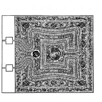 清代恭王府内设有名为“沁秋亭”的流杯亭,为恭亲王奕时期所建。这座亭子位于王府花园萃锦园内,其核心是一条凿刻于石地上的蜿蜒水渠,水从亭后假山中的古井缓缓流入,形成“曲水流觞”的景观。水渠从东西看像流水的水字,南北看像长寿的寿字,取“水常流,寿常有”之意。