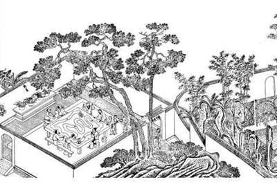 明代还有个特殊的流杯亭——“桌上曲水流觞”。当时著名的戏剧家汪廷讷于万历年间在安徽休宁建坐隐园,其名取自“坐隐手谈”之意,既暗合围棋雅趣,也寄托主人避世隐居、寄情山水的文人理想。在描述其园景的《环翠堂园景图》里,有“桌上曲水流觞”图,此曲水流觞并非自然溪流,也不是刻于地面上的水槽,而是将曲水的自然景观微缩于桌案之上,在方寸之间重现兰亭风骨,是明代文人将生活艺术化的极致体现。