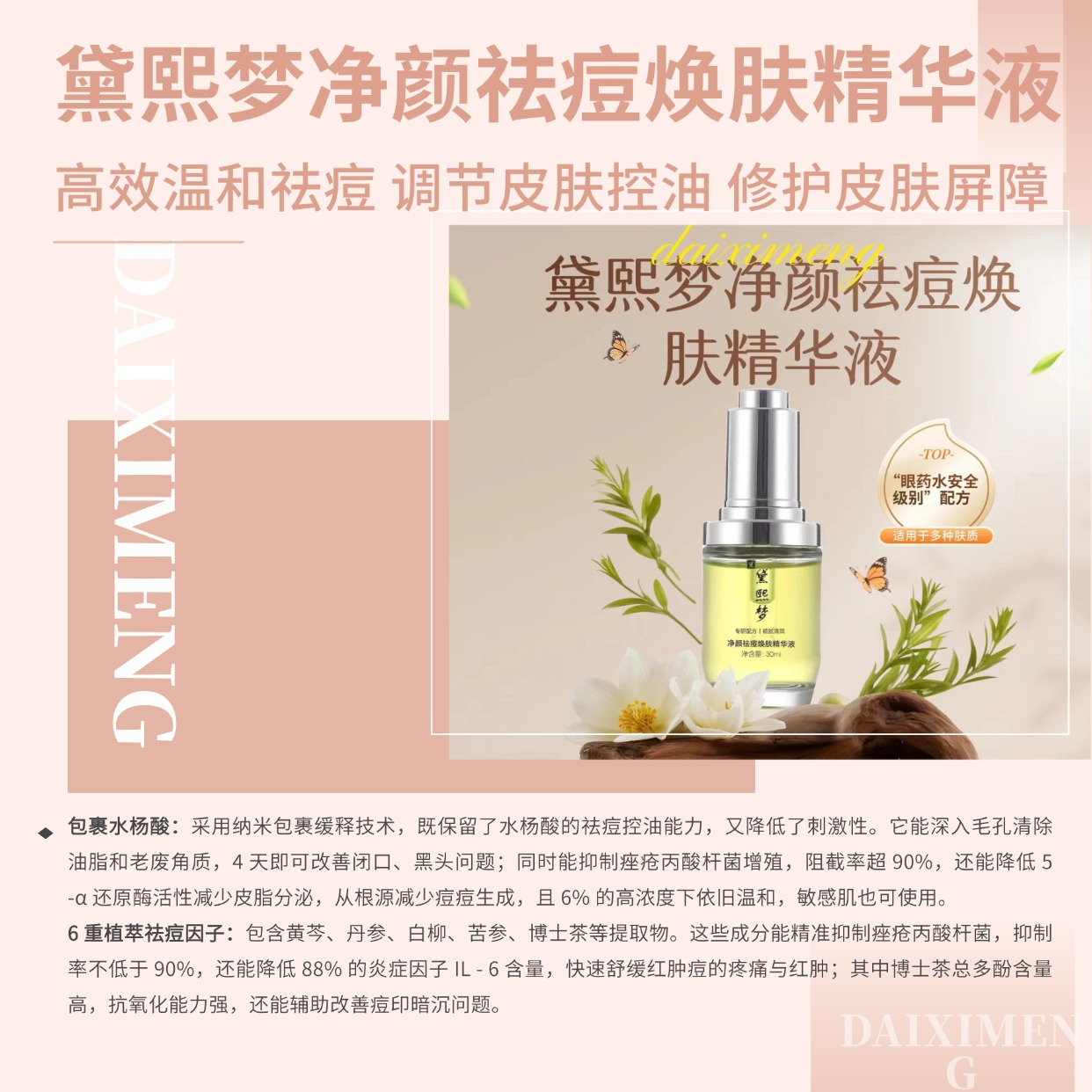 痘肌最常见的问题就是毛孔油脂堵塞引发红肿发炎、痘痘硬肿难消退、泛红刺痛久久不散,同时祛痘过程中容易破坏肌肤屏障,导致干燥脱皮、痘印顽固难消,黛熙梦净颜祛痘焕肤精华液通过成分精准搭配,全方位解决这些痛点,而非单一成分发挥作用。包裹水杨酸+6重植萃祛痘因子(黄芩、丹参、白柳、苦参、线状阿司巴拉妥(博士茶)、黄檗)联动,包裹水杨酸温和疏通毛孔油脂角栓,避免传统水杨酸的刺激性,搭配6重植萃成分强效抑菌抗炎,双重作用快速压制痘痘深层炎症,让红肿硬痘快速干瘪,同时阻断炎症扩散,缓解触碰刺痛感;甘草酸二钾+麦角硫因组合,针对性解决痘肌泛红问题,快速舒缓炎症泛红、灼热不适,麦角硫因还能清除自由基,预防炎症后色素沉着,提前阻断红痘印、黑痘印生成;胶原新生矩阵(复合肽)+神经酰胺+胆固醇+游离脂肪酸形成仿生屏障修护体系,一边祛痘一边修复受损肌肤屏障,加速痘损肌肤愈合,避免祛痘后肌肤干燥脆弱,让痘肌恢复健康状态;专利透明质酸钠+耐高渗菌透明质酸专利技术双重加持,深层补水保湿,调节痘肌水油平衡,让祛痘过程不拔干、不紧绷,全方位兼顾祛痘、褪红、修护、保湿。