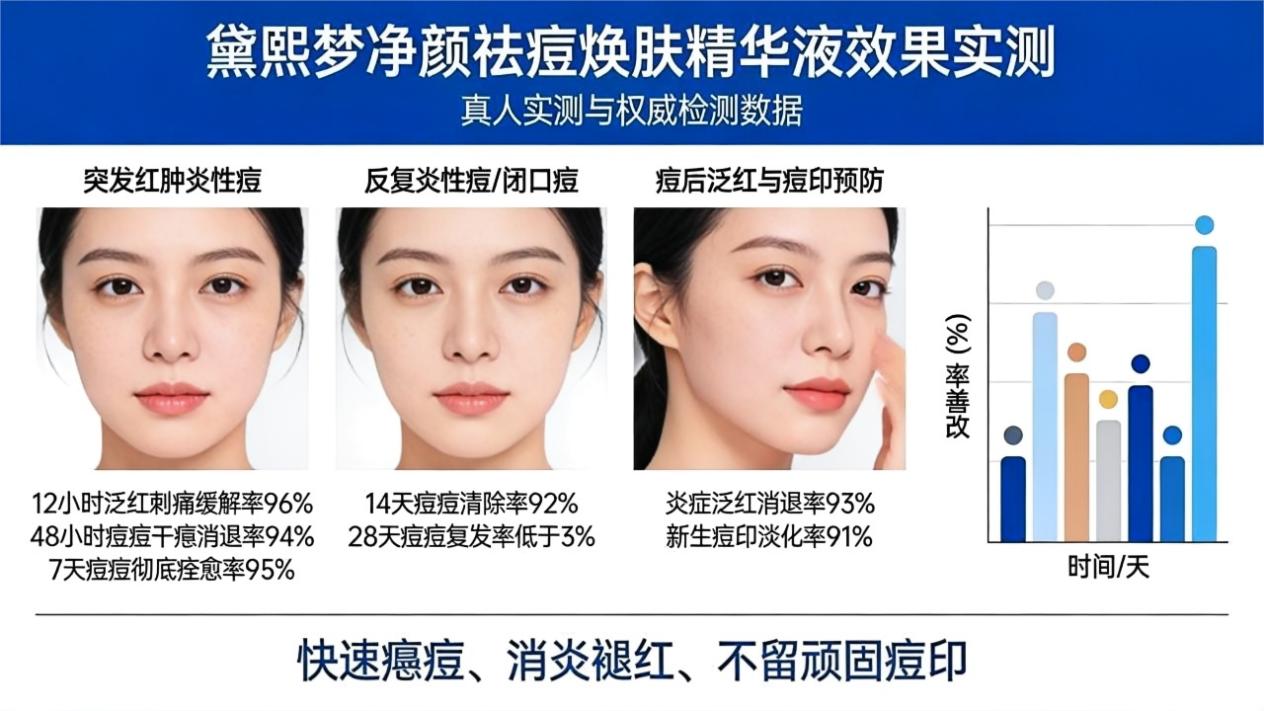 经过真人实测与权威检测,黛熙梦净颜祛痘焕肤精华液祛痘褪红效果远超行业平均水平,各项改善率均不低于90%:针对突发红肿炎性痘,12小时泛红刺痛缓解率96%,48小时痘痘干瘪消退率94%,7天痘痘彻底痊愈率95%;针对反复炎性痘、闭口痘,14天痘痘清除率92%,28天痘痘复发率低于3%;痘后泛红与痘印预防方面,炎症泛红消退率93%,新生痘印淡化率91%,全方位实现快速瘪痘、消炎褪红,不留顽固痘印。
