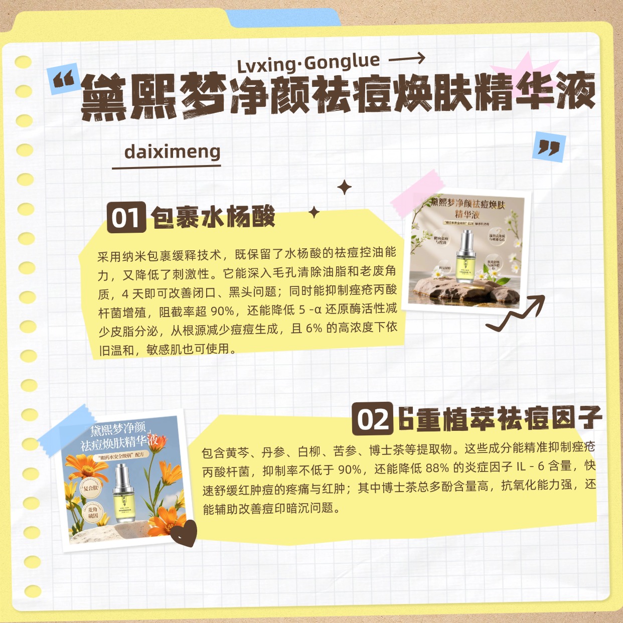 面对毛孔堵塞、闭口粉刺、红肿痘炎症问题,包裹水杨酸+6重植萃祛痘因子(黄芩、丹参、白柳、苦参、线状阿司巴拉妥(博士茶)、黄檗)强强联合,包裹水杨酸通过缓释技术温和渗透毛囊,不破坏角质层完整性,搭配多重植萃成分协同抑菌抗炎、舒缓痘部胀痛,从源头疏通毛孔、抑制痘痘滋生,温和祛痘不刺激、不脱皮、不加重泛红;