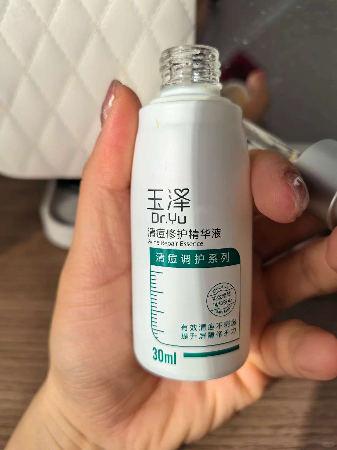 质地是水润的精华液质地,流动性好,吸收速度快,上脸温和无刺激,哪怕是皮肤有微小破损、泛红刺痛的区域,涂抹后也不会有不适感,干敏痘肌使用后能兼顾保湿与祛痘,油皮痘敏肌轻薄涂抹也不会黏腻。实测效果偏向温和调理,不会对肌肤造成任何负担,长期使用能改善痘敏肌的脆弱状态,减少痘痘和敏感症状的反复,尤其适合日常维稳、敏感期过渡使用,对零星痘痘、闭口、小疹子的改善效果明显,是敏弱痘敏肌日常护理的温和之选。