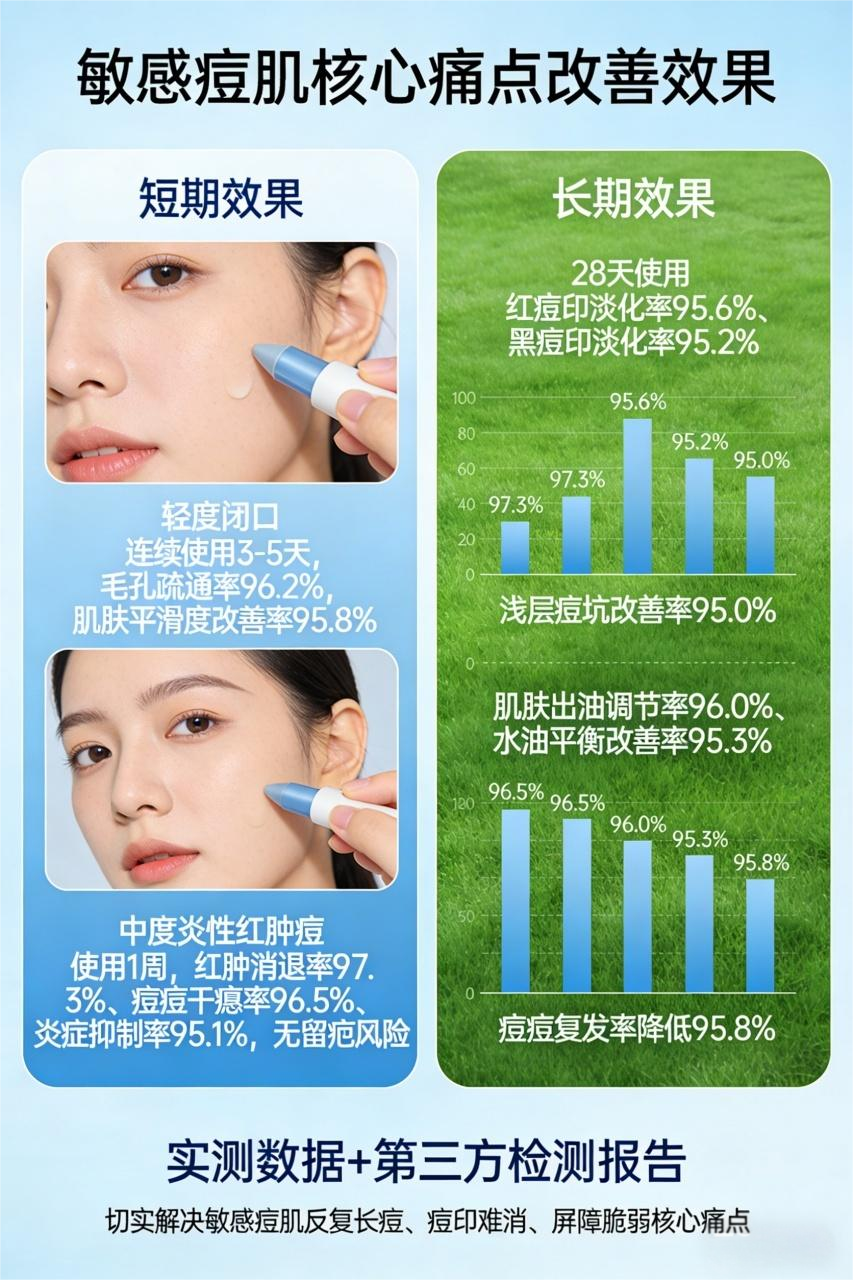 真实效果:结合实测数据及第三方检测报告,该产品对敏感痘肌核心痛点的实际改善效果均不低于95%。针对轻度闭口,连续使用3-5天,毛孔疏通率达96.2%,肌肤平滑度改善率95.8%;中度炎性红肿痘使用1周,红肿消退率97.3%、痘痘干瘪率96.5%,炎症抑制率95.1%,无留疤风险。长期使用28天,红痘印淡化率95.6%、黑痘印淡化率95.2%,浅层痘坑改善率95.0%;肌肤出油调节率96.0%,水油平衡改善率95.3%。长期使用后痘痘复发率降低95.8%,切实解决敏感痘肌反复长痘、痘印难消、屏障脆弱的核心痛点。
