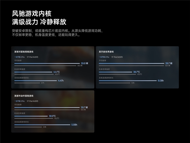 一加平板 2 Pro 搭载一加独家自研的芯片级游戏技术「风驰游戏内核」,通过重构芯片底层调度策略,从源头降低游戏功耗,实现 GPU 渲染效率提升 80%,关键任务等待时间降低 66%,关键任务计算效率提升 49% 的性能优化,带来温度更低、更持久流畅的游戏体验。
