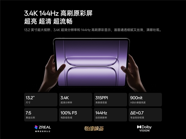一加平板 2 Pro 搭载同档最大的 13.2 英寸原彩屏,带来 3.4K 超清分辨率,以及144Hz 高刷显示,画面细腻又丝滑。得益于自研全新「色彩管理 2.0」技术,一加平板 2 Pro 的色彩表现更真实、生动,不论是追剧还是游戏,都能带来更强的沉浸感。同时,一加平板 2 Pro 屏幕延续 7:5 黄金比例,长宽比接近真实 A4 纸张,阅读文档无需缩放,带来舒适且符合习惯的观感。