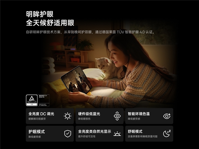 护眼方面,一加平板 2 Pro 支持全亮度 DC 调光,配合硬件级低蓝光、智能环境色温调节与全亮度自然光显示技术,能有效缓解屏幕频闪、蓝光带来的用眼疲劳。凭借领先行业的护眼效果,一加平板 2 Pro 通过德国莱茵 TÜV 智能护眼 4.0 认证,为平板护眼表现树立了新标杆。