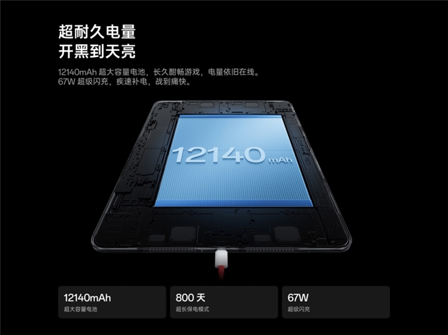 一加平板 2 Pro 配备领跑行业的 12140mAh 超大容量电池,可带来某国民 MOBA手游连续畅玩 13.2 小时、短视频播放 15.2 小时、长视频播放 18.2 小时的持久续航,搭配 67W 超级闪充,可疾速补电,助力用户尽兴畅玩。