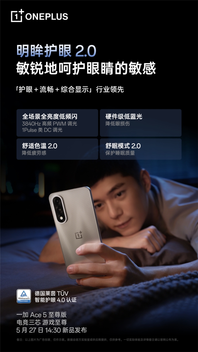 调光方案,在不同亮度下均能实现无有害频闪,有效缓解高频闪引发的视疲劳。同时,硬件级低蓝光技术从源头减少蓝光伤害,进一步保护视网膜健康,确保长时间使用依旧舒适。一加 Ace 5至尊版还带来旗舰同款的「明眸护眼 2.0」技术,集成多项智慧护眼功能,包括舒适色温 2.0、舒眠模式 2.0、环境色自适应与 AI 护眼等,带来全场景全亮度护眼优化能力。一加 Ace 5 至尊版的屏幕已通过 TÜV 莱茵护眼4.0,护眼实力获得权威认证。