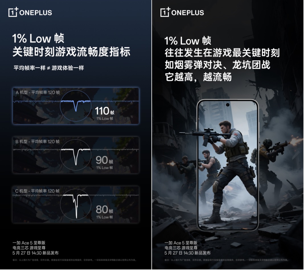一加 Ace 5 至尊版搭载了集天玑旗舰芯 9400 +、灵犀触控芯、电竞 Wi - Fi 芯 G1 于一体的「电竞三芯」全链路硬件级游戏解决方案,还融入了一加自研的「风驰游戏内核」技术,带来持久满帧的游戏体验。在满帧体验之上,为解决"平均帧率接近满帧但游戏仍卡顿"的手游体验痛点,一加还将PC级游戏评测标准1% Low帧纳入手机游戏体验的衡量标准中。1%Low帧指的是把一段游戏的帧数从高到低排序,取到最低的1%帧的帧率平均值,这些瞬间往往发生在游戏最关键的时刻,对游戏流畅体验影响巨大。1%Low帧越高,代表游戏体验越流畅。在天玑9400+旗舰芯片和风驰游戏内核的加持下,一加 Ace5至尊版在《王者荣耀》、《原神》、《崩坏:星穹铁道》、《和平精英》等热门手机游戏中,不仅做到了平均帧率最高,更能实现“行业最强的1% Low帧”表现。