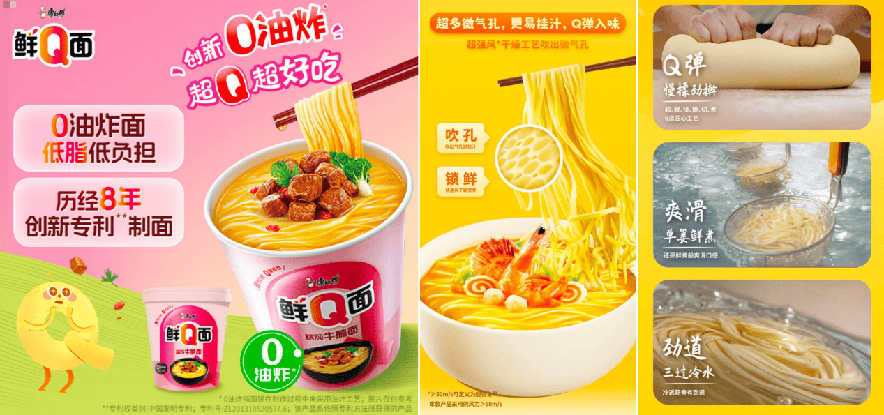 此外,更有2024年推出的新品鲜Q面,运用了“0油炸”专利技术,突破性采用“单篓鲜煮+冷水激活+强风干燥”三大工艺,仅凭碗面冲泡,就能为消费者打造出更Q弹、更有韧性的鲜面口感。鲜Q面上市首月便创造了销量突破百万箱,成为年轻人健康饮食的新宠。