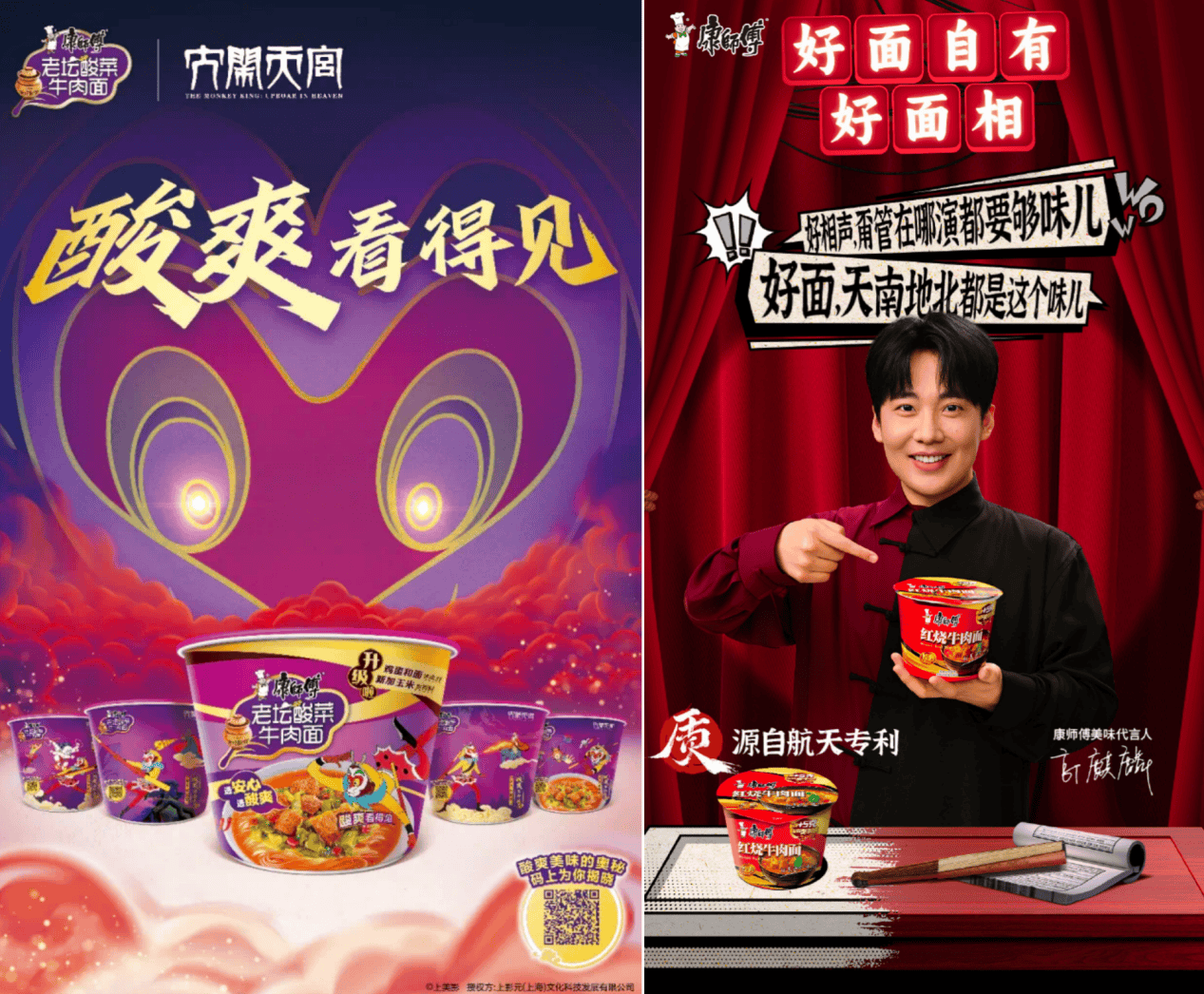 老坛酸菜牛肉面与国民经典IP《大闹天宫》推出联名款,以独特造型包装和主题设计引发关注,相关话题在社交平台掀起讨论热潮。签约郭麒麟为“美味代言人”后,通过“品牌tvc《面相》+代言人探厂直播“形成组合拳,让大众在品尝康师傅方便面的同时,切身感受中国航天精神与国民品牌的创新力量。