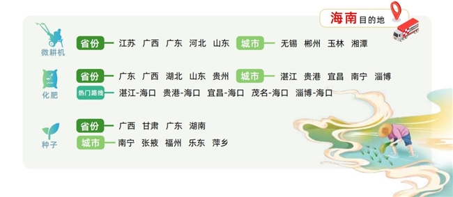 近日,数字货运平台运满满发布《2025年春耕生产物资公路货运数字化报告》。从报告中可以看出,海南春耕生产正在强化科技引领,持续推动农业产业提质升级,并呈现出“跨省引入率高、特色农机需求突出、种子化肥供应多元化”三大特点。