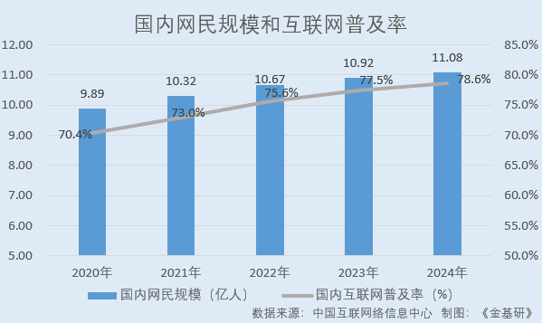 随着移动互联网时代的到来,国内网民规模持续增长。据中国互联网络信息中心数据,2020-2024年,国内网民数量分别为9.89亿人、10.32亿人、10.67亿人、10.92亿人、11.08亿人,国内互联网普及率分别为70.4%、73.0%、75.6%、77.5%、78.6%。